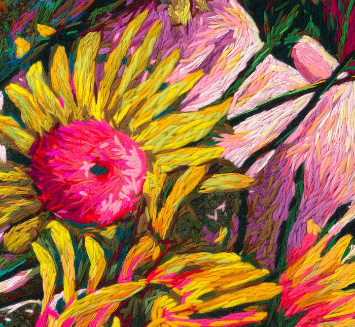 Crewel Intentions is a collection of textured, saturated portraits inspired by editorials and advertisements from Playboy magazines from the 1970s.